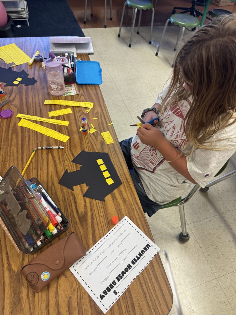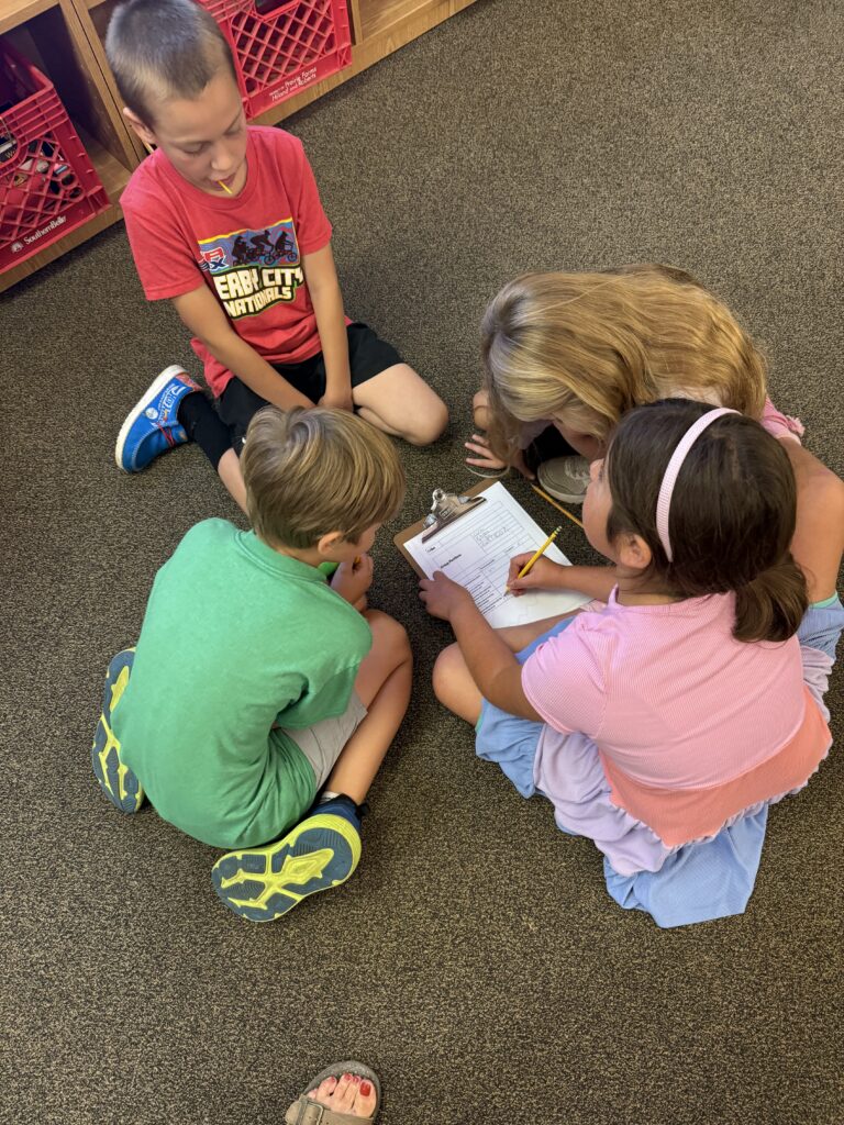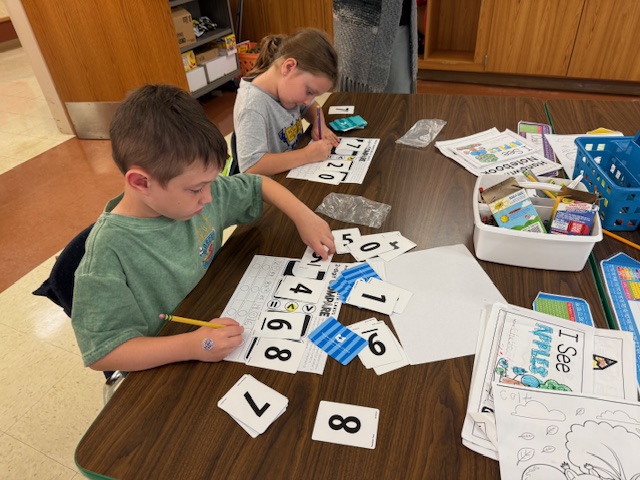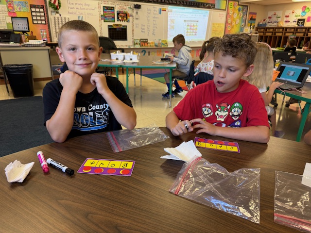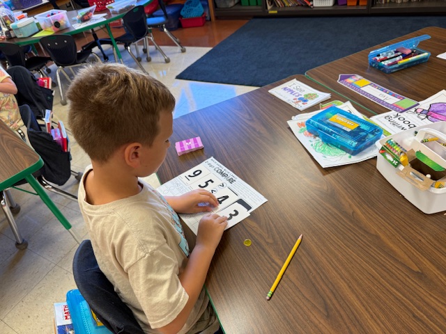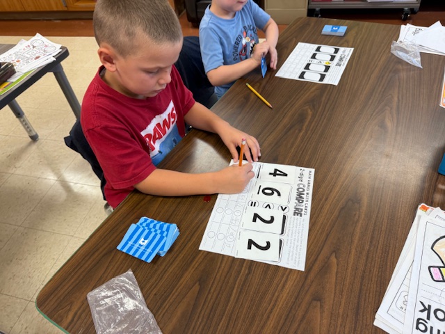 First graders working hard on comparing numbers and learning to use Elkonin boxes for sounding out words.