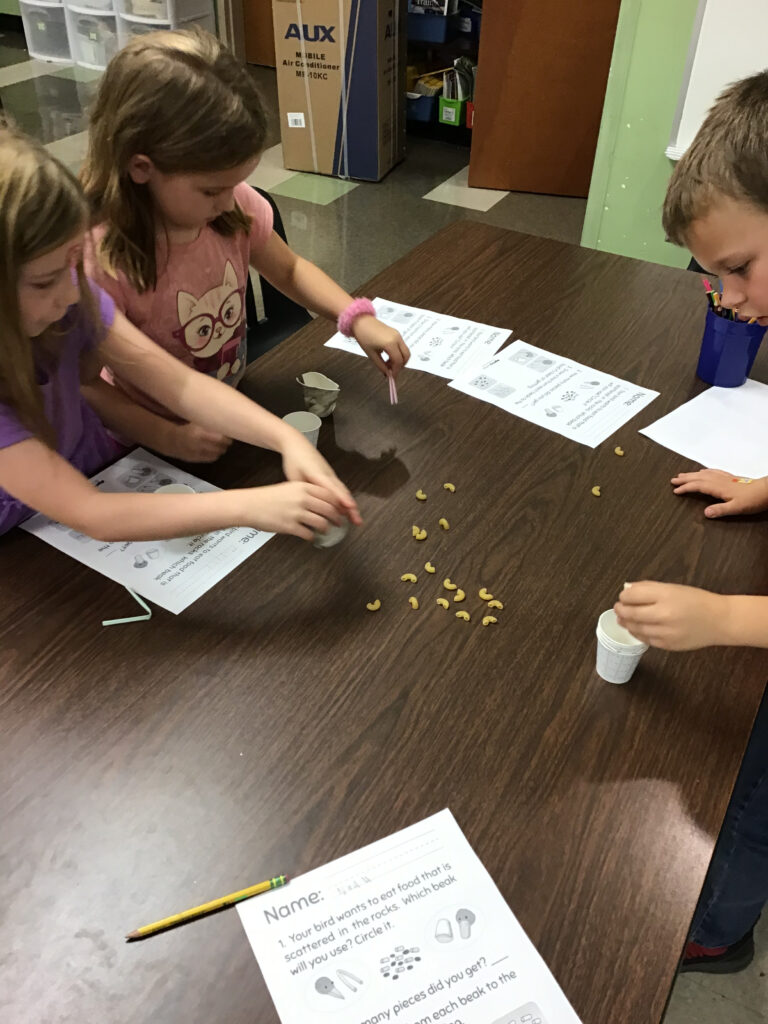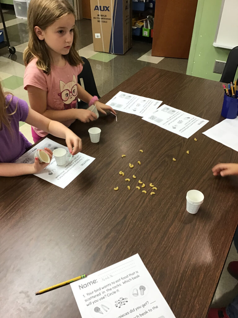 First graders discovering why different birds have different types of beaks. These students are trying model warbler beaks and model duck beaks to see which beak works best for picking up the model food (macaroni).