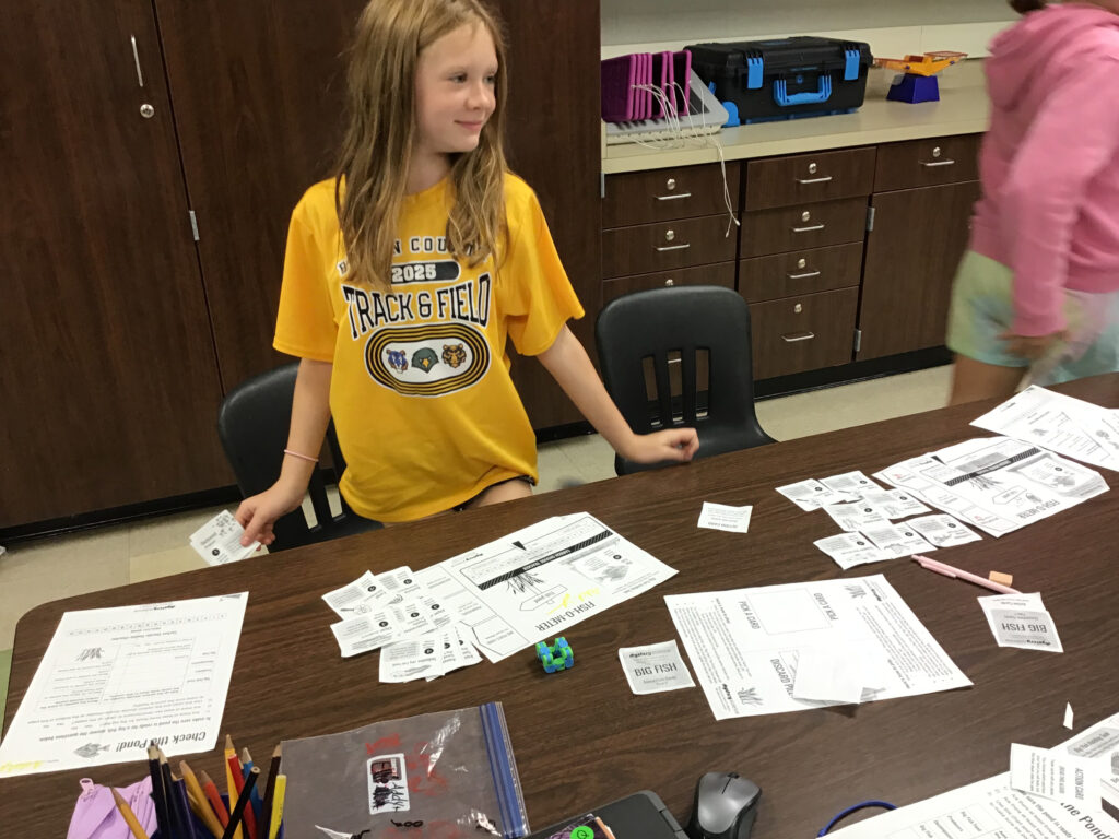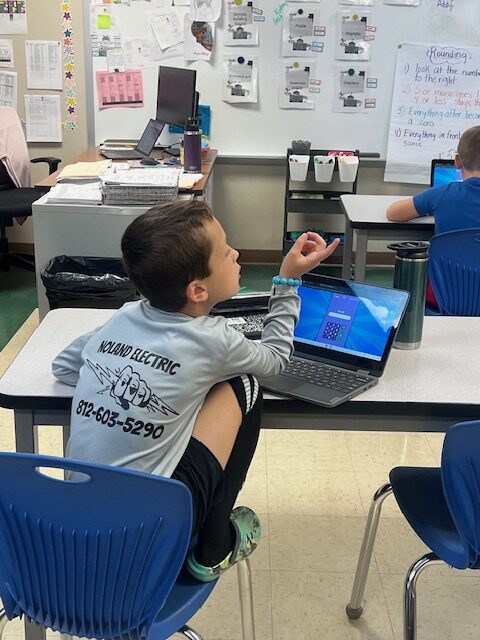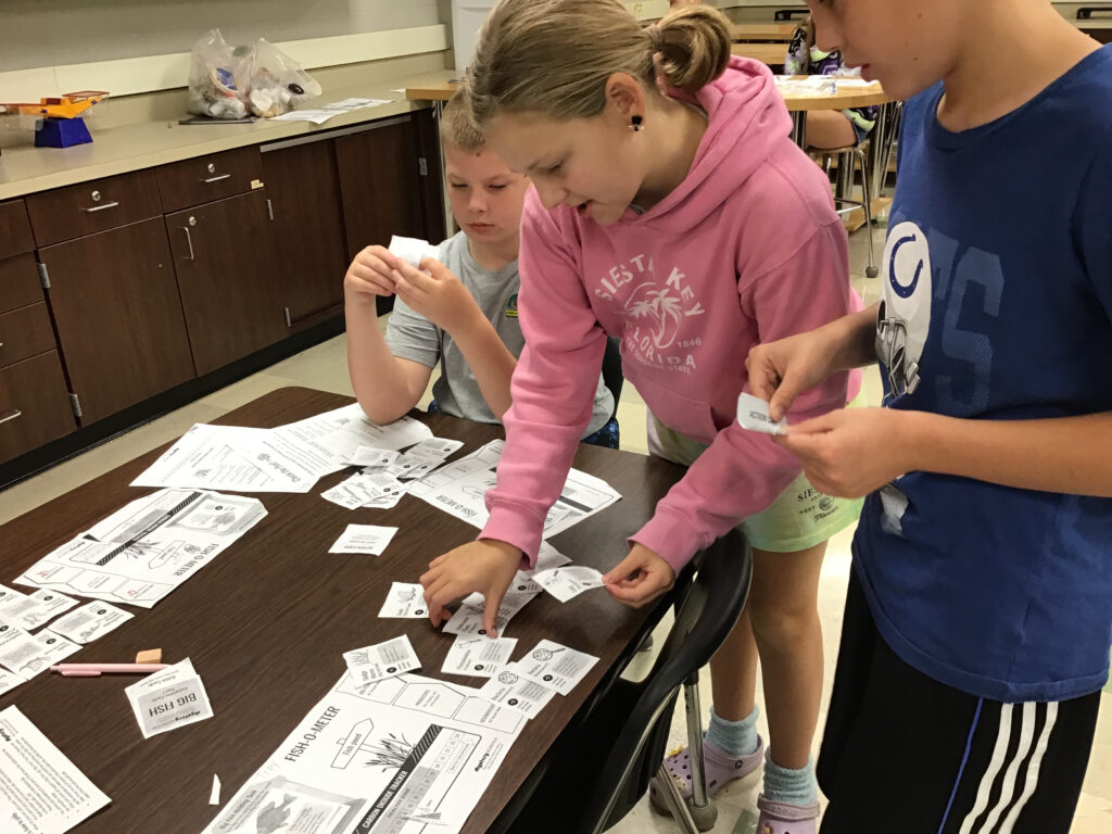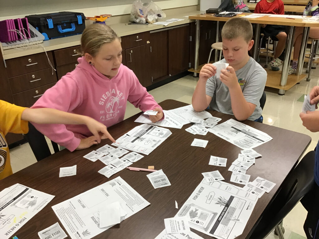 Fifth grade playing a STEM game called Big Fish. In this activity, students have to find the right combination of decomposers, producers, and consumers to be in their model pond in order to add their big fish to the pond.