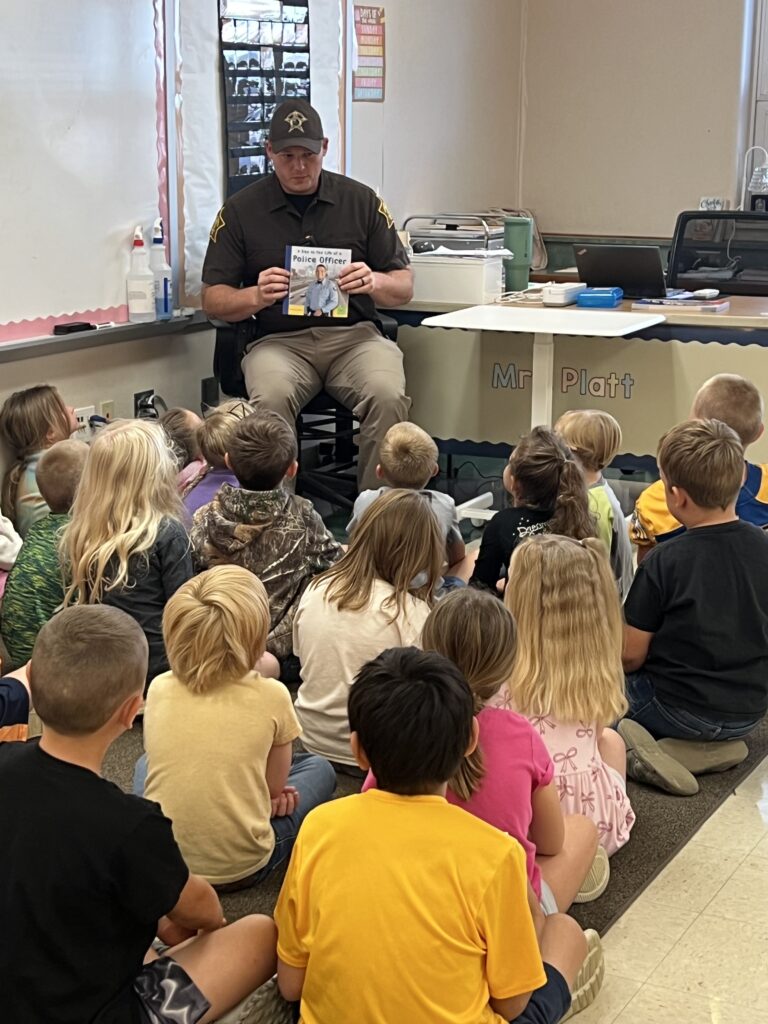 This week, the first graders had a visitor, student resource officer Minor. He came to read them a story and talk about sheriffs and police officers. Officer Minor spoke about the differences between sheriffs and police officers, uniforms, and how they help in their communities. The first graders loved having Officer Minor visit and had a lot of questions for him. It was a very good time.