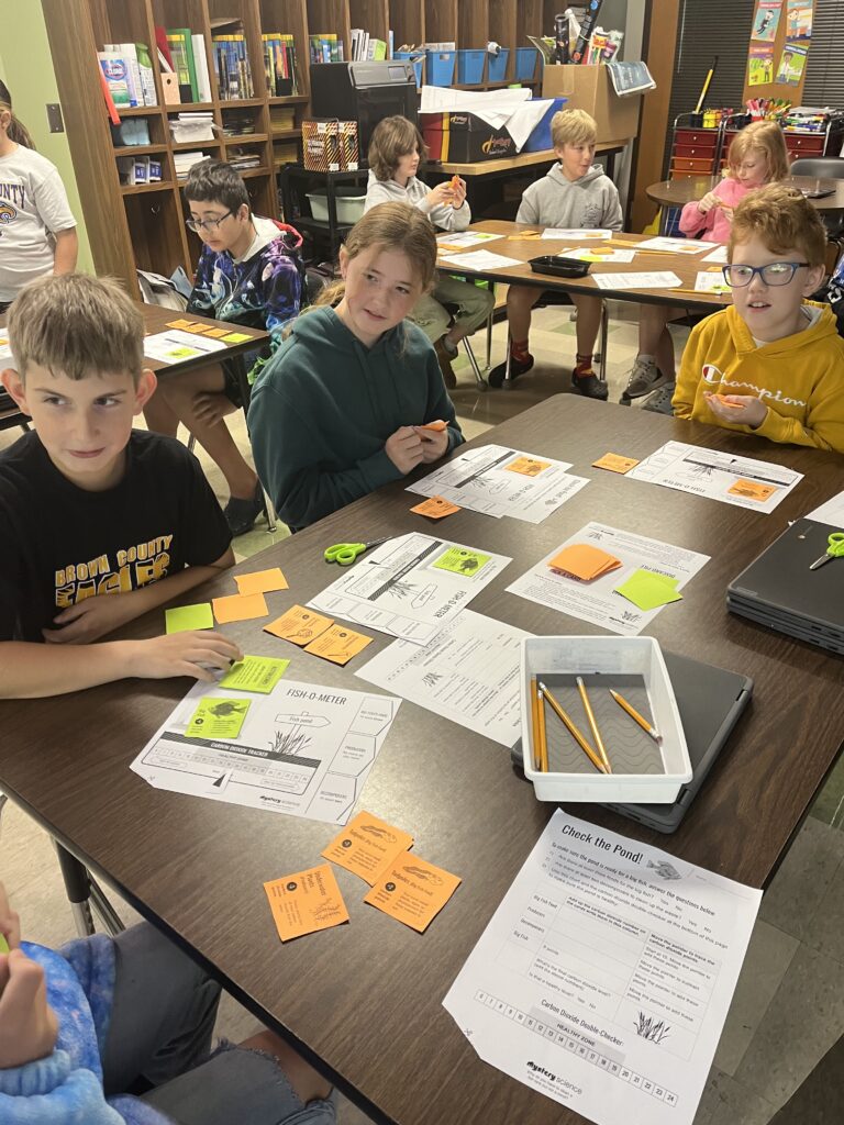 Kindergarten students observed different animal behaviors and worked to discover another pattern: all animals seek safety in order to survive. The activity, Gopher in a Hole, included physical movements in which students pretended to be snails hiding in their shells, praying mantises scaring away predators, and gophers popping out of holes.competed to make a healthy ecosystem for a sunfish.
