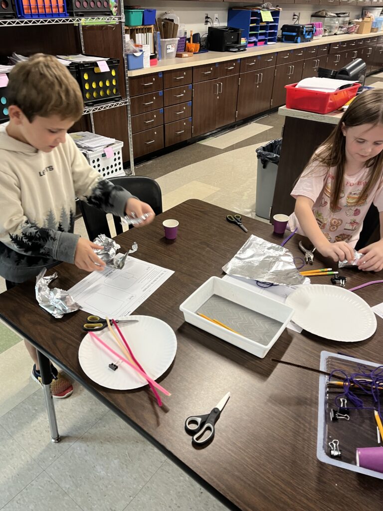 Students in grades 2-5 worked on STEM Bin rotations this week. Groups of 2-3 students worked to complete specific challenges at each station. Challenges included building platforms to support weight, solving pattern puzzles, building challenges, and completing pictures to represent different objects. Students in grades 4-5 also used our cardboard tools and their imagination to create everyday objects. Some of our 5th graders made a logo board. Very creative!