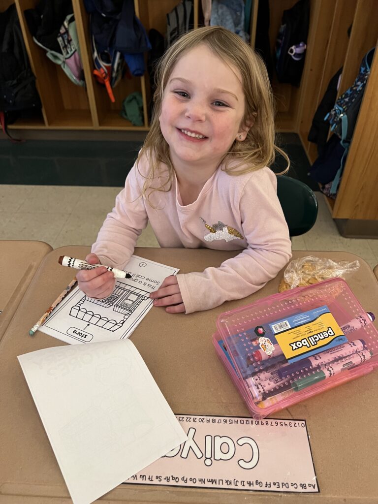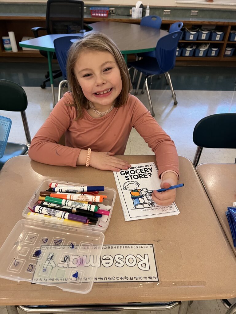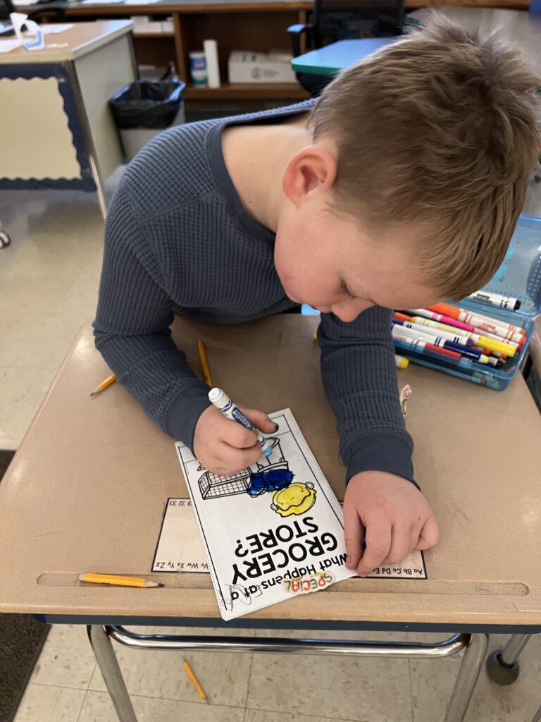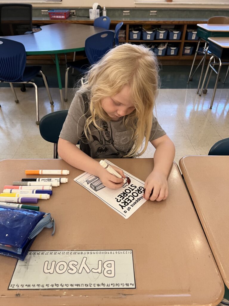 In Mrs Platt’s first grade class, students learned about the community helpers of a grocery store. They read a booklet about a grocery store and drew pictures and answered a question about how grocery stores get the food for people to buy. They enjoyed doing this activity.