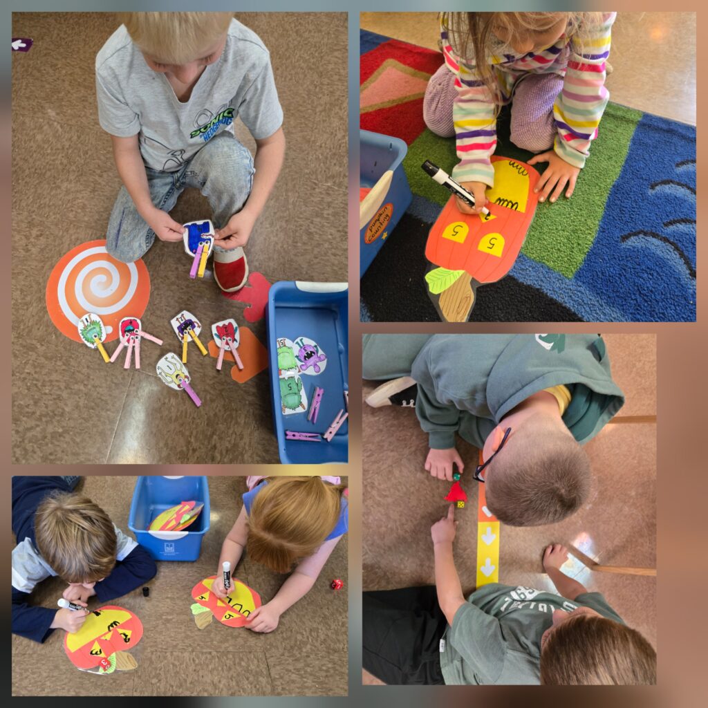 Kindergarten has been working on their numeracy skills by comparing numbers with greater gator, putting eyes on monsters, and using pumpkin teeth to complete addition problems.