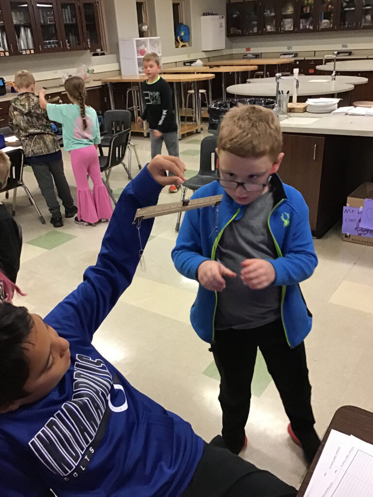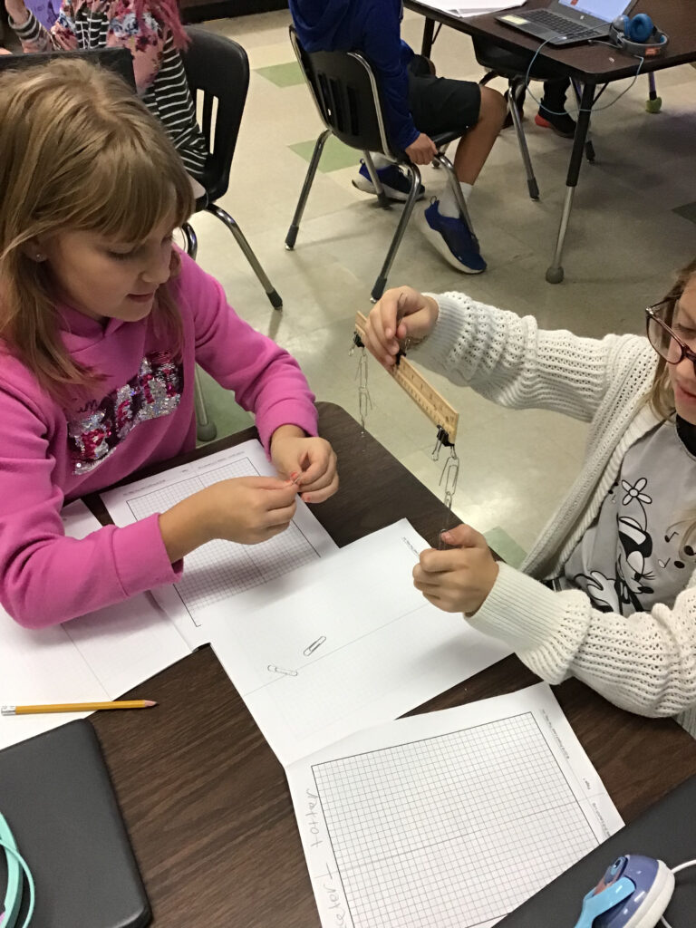 3rd graders building and testing hanging teeter totters to learn about balanced and unbalanced forces.