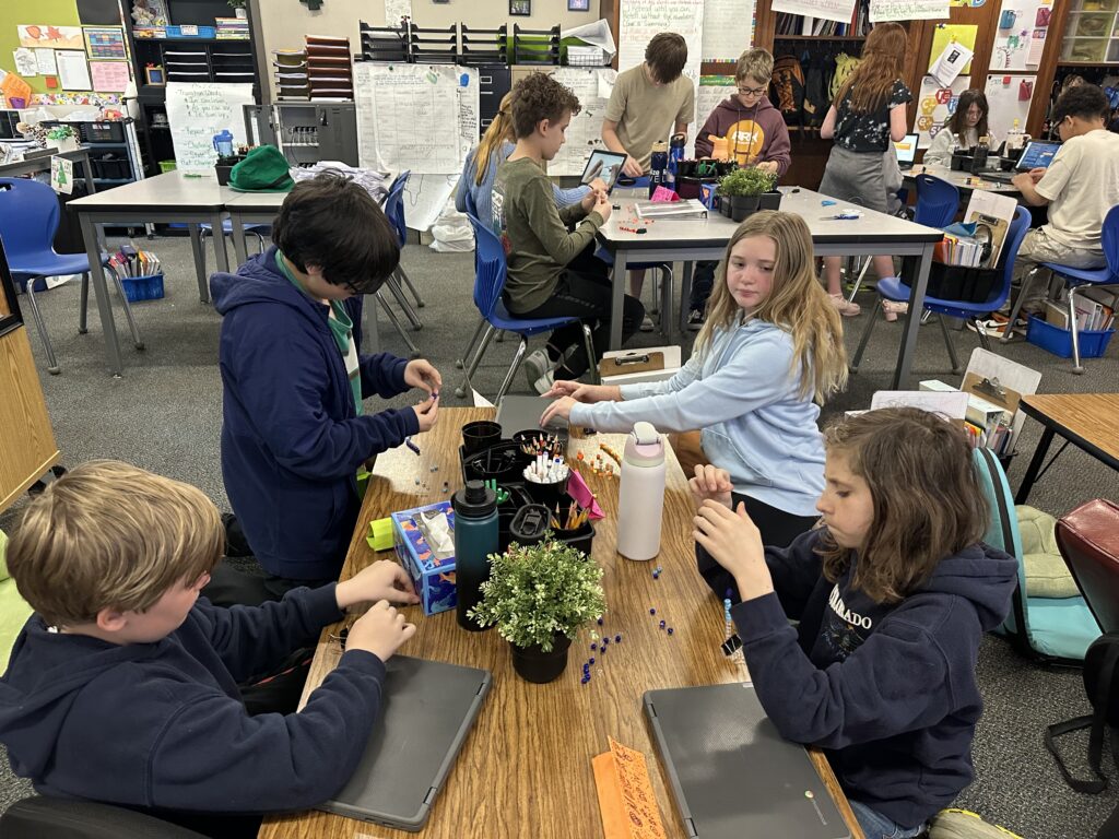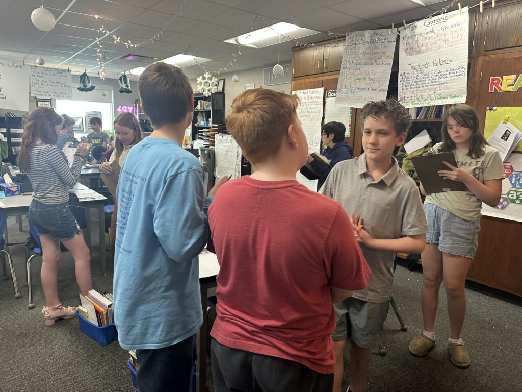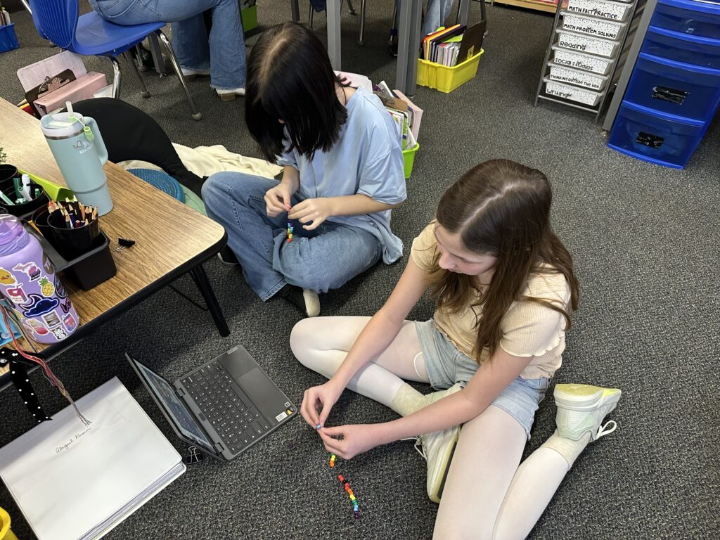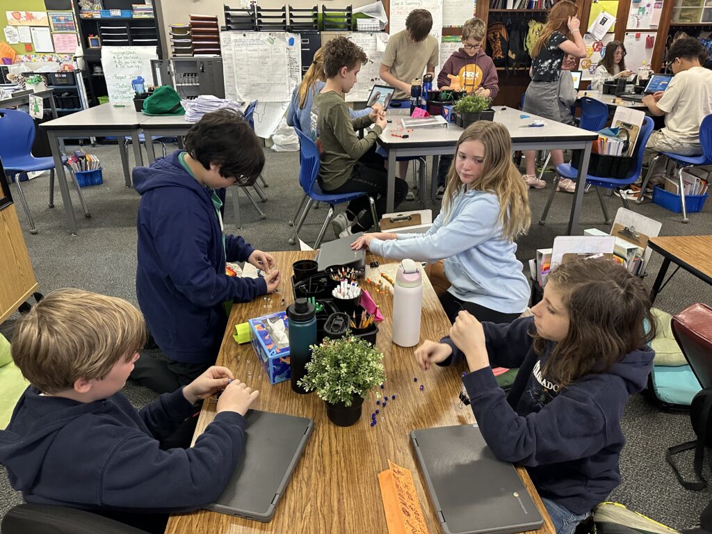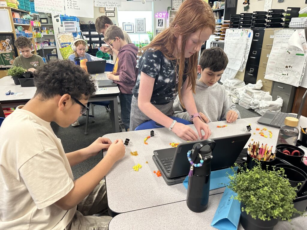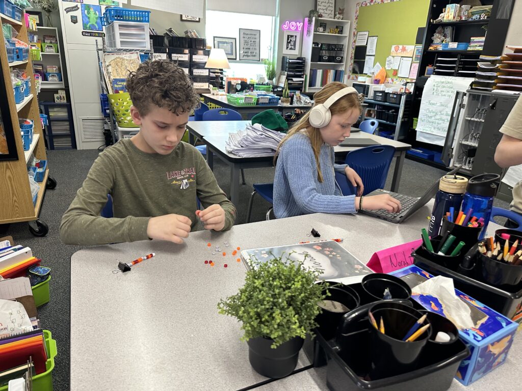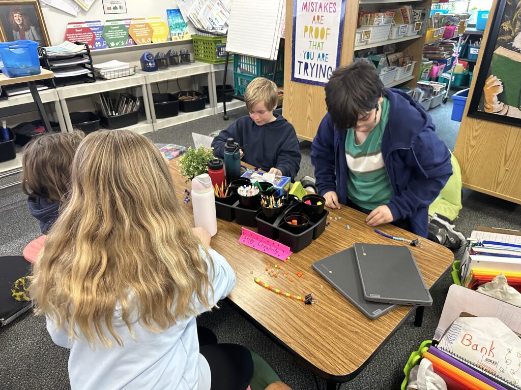 In reading, we are reading Rebellion, 1776, and we are also reading Percy Jackson. A lot of us are really enjoying both books. Rebellion, 1776 connects with what we are learning in Social Studies, and Percy Jackson has taken us into Mythos Quarter, where our classroom feels like a quest. We are now working in cabins and earning points on a leaderboard. We rise and fall together as a cabin, so we have to work as a team. We even made matching bracelets with our cabin partners, which was really fun. Our Percy Jackson module has made our classroom feel magical, mysterious, and exciting.