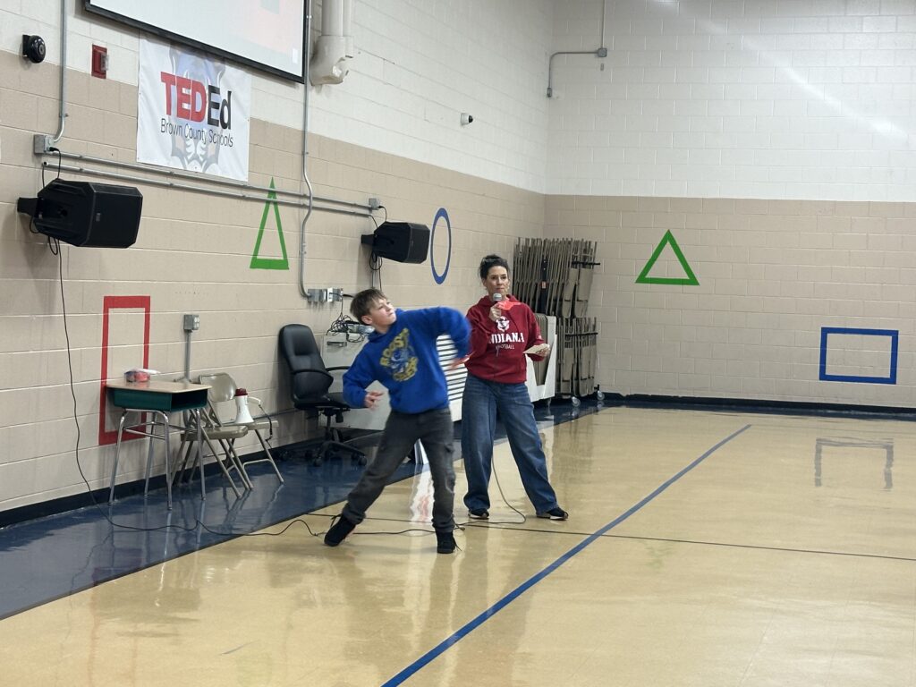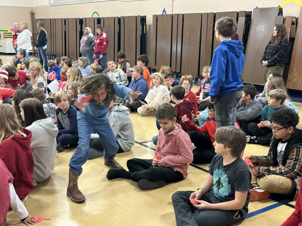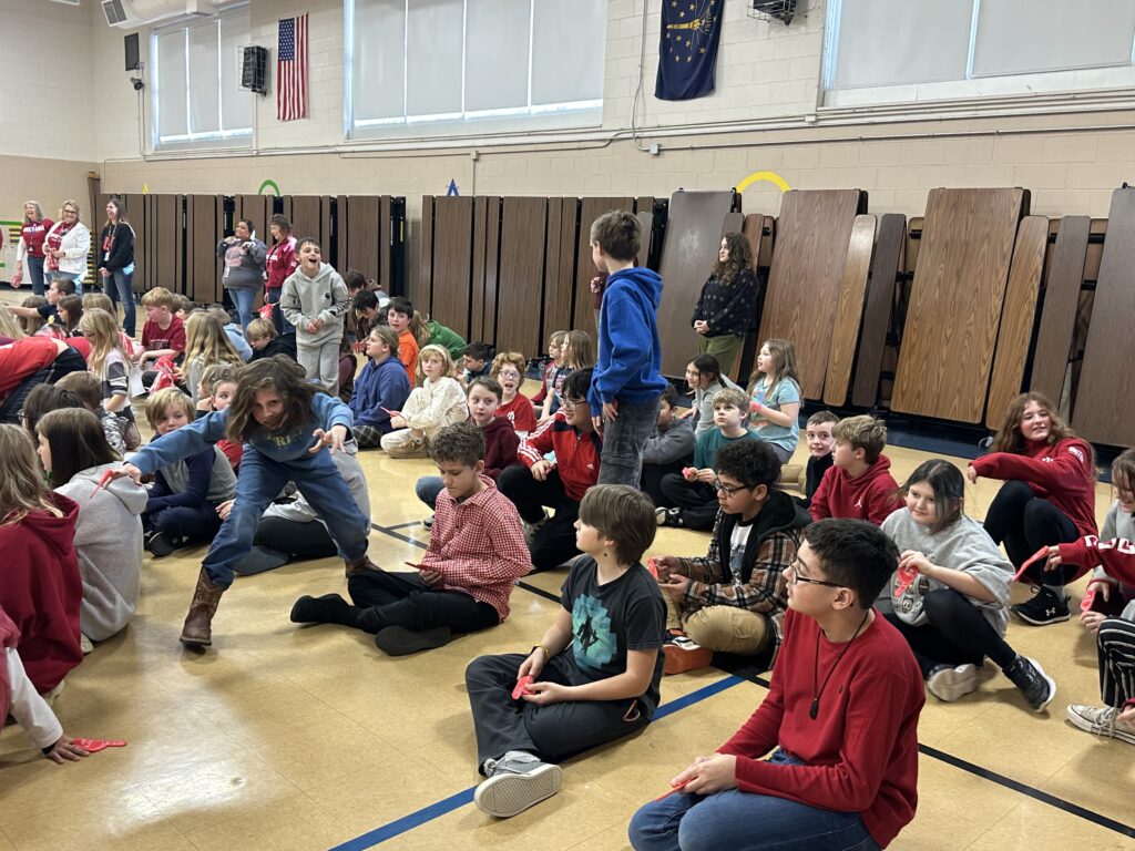 This week on Monday we had a pep rally for the IU game. Go Hoosiers!! Everybody got a mini squishy football and a mini hand that says we’re #1 and on the back it says let’s go. We learned the IU fight song. We also did some chants like go big red.