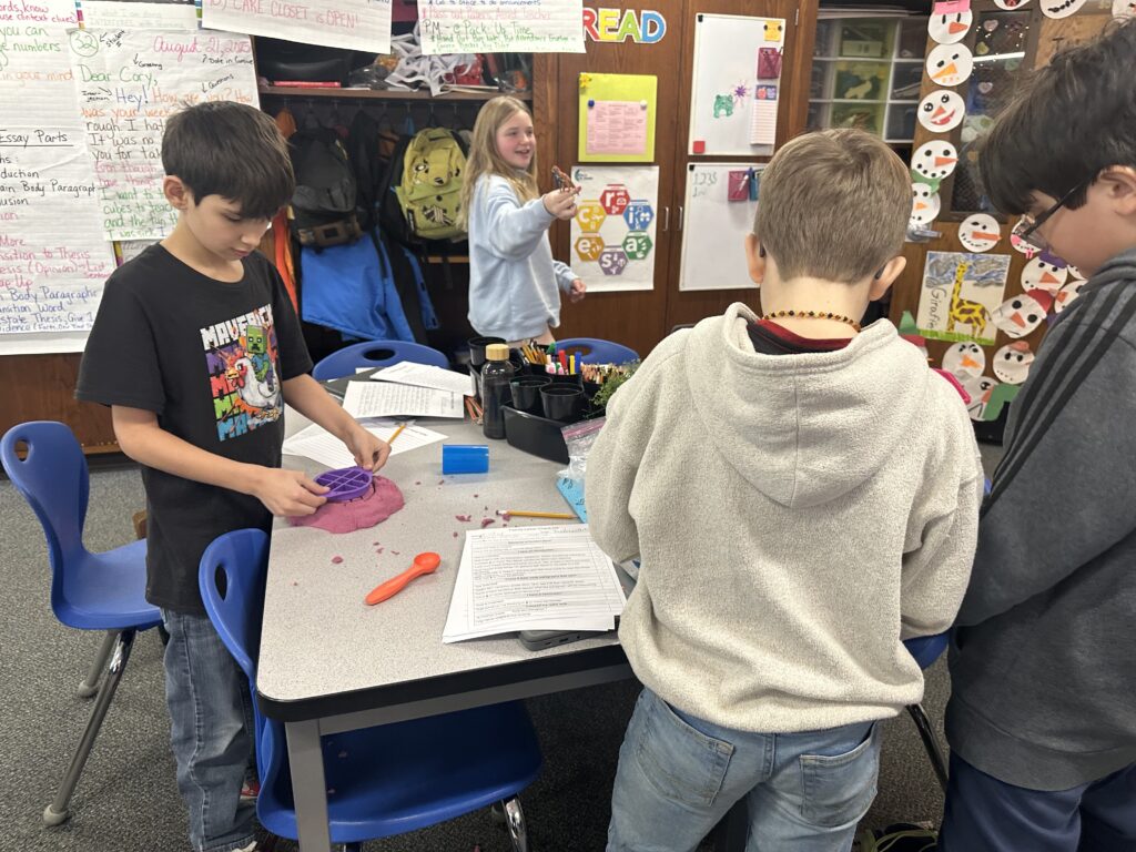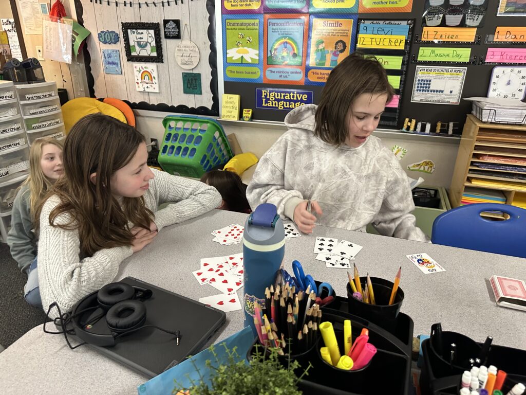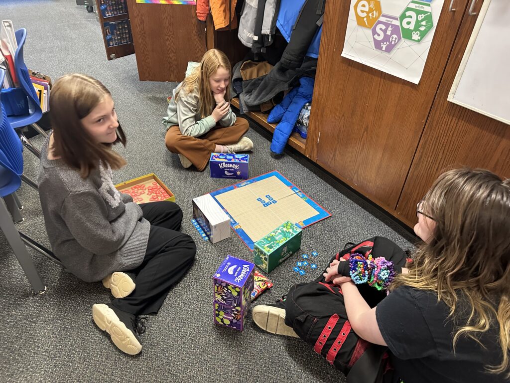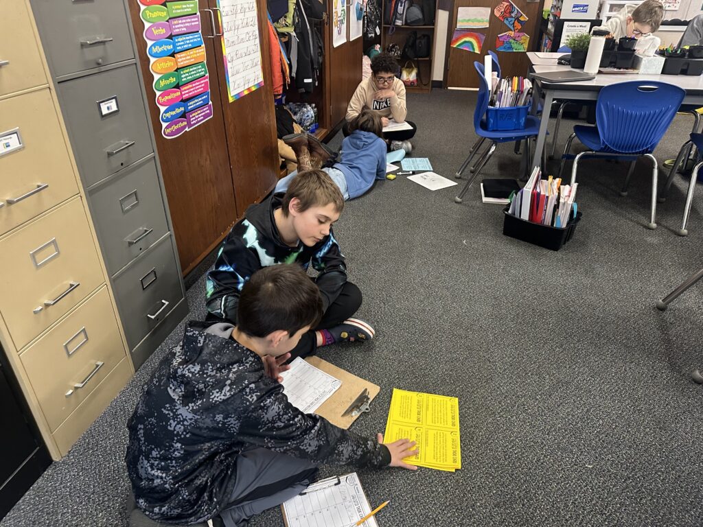 We did so many fun activities and games this week. We did lots of Blookets! They were over helping verbs, progressive verb tenses, and plot. We also did a flick the football game in math where we were reviewing additive volume. It’s where you flick a paper football to score points. There are different colored chips. Red chips let you put an obstacle in front of another team.Blue gives you another turn. Green lets you move closer to the goalpost. Purple chips let you shoot farther back for double points. Whoever has the most yellow chips gets to decide the flicking order.
