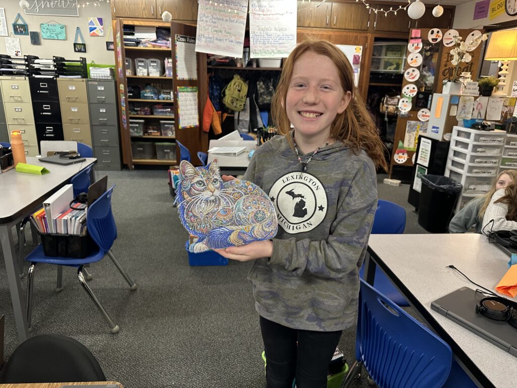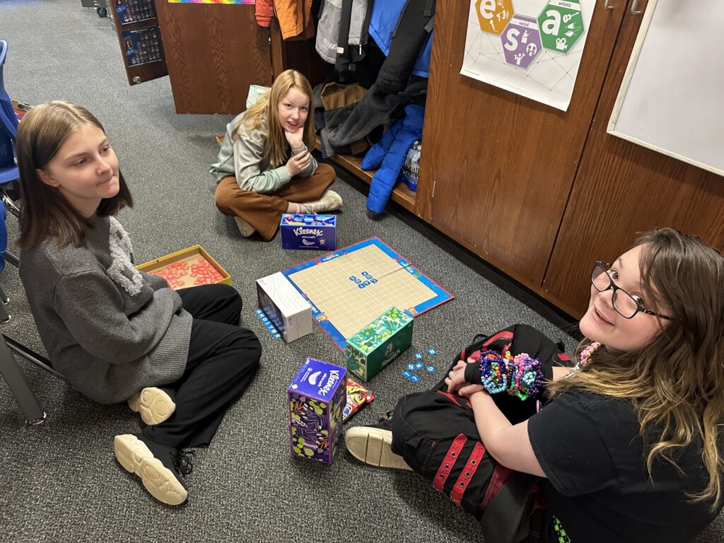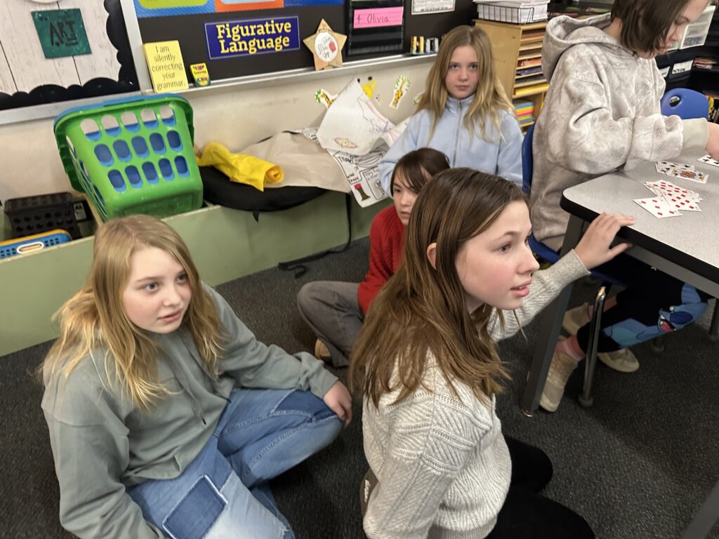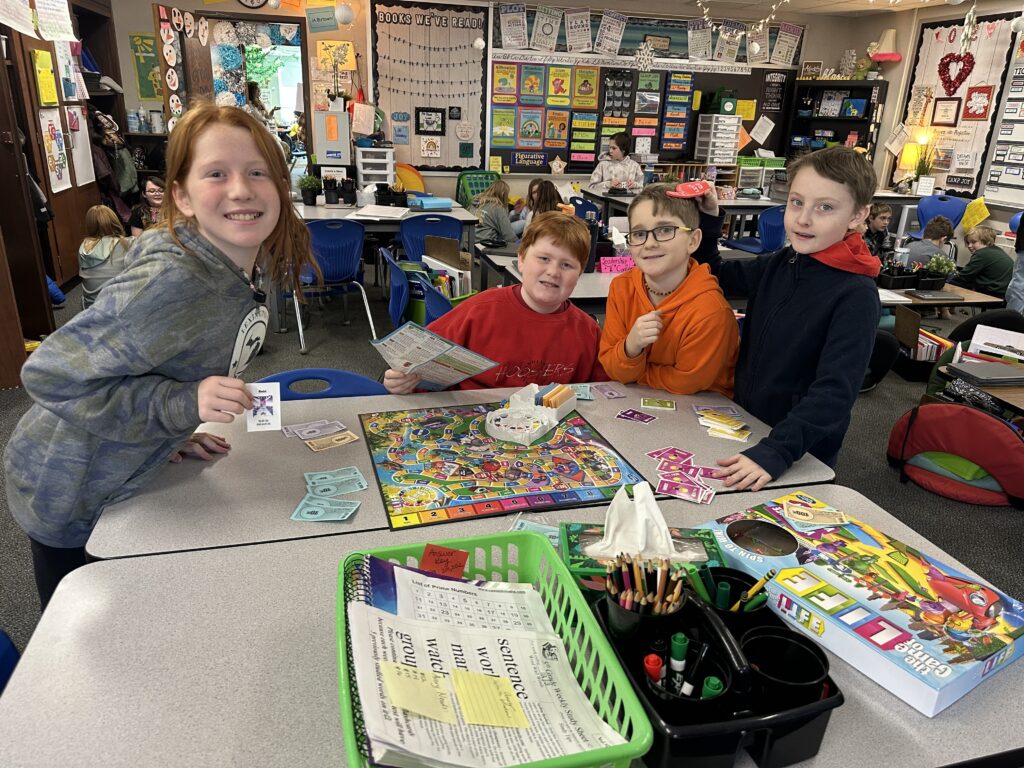We did so many fun activities and games this week. We did lots of Blookets! They were over helping verbs, progressive verb tenses, and plot. We also did a flick the football game in math where we were reviewing additive volume. It’s where you flick a paper football to score points. There are different colored chips. Red chips let you put an obstacle in front of another team.Blue gives you another turn. Green lets you move closer to the goalpost. Purple chips let you shoot farther back for double points. Whoever has the most yellow chips gets to decide the flicking order.