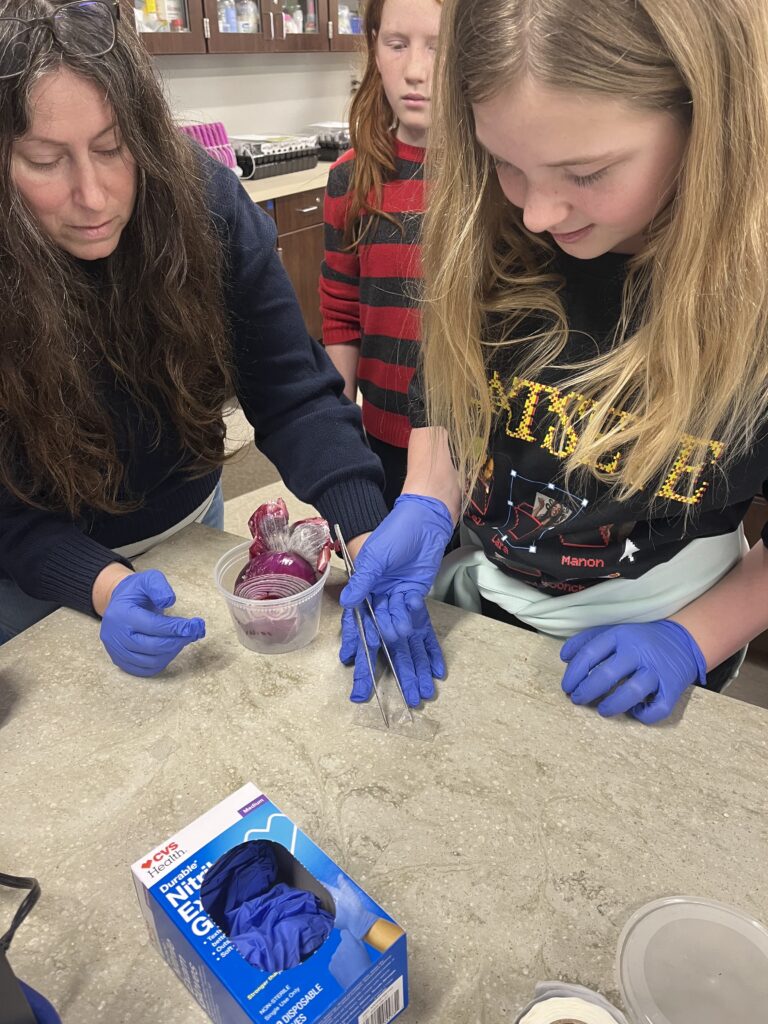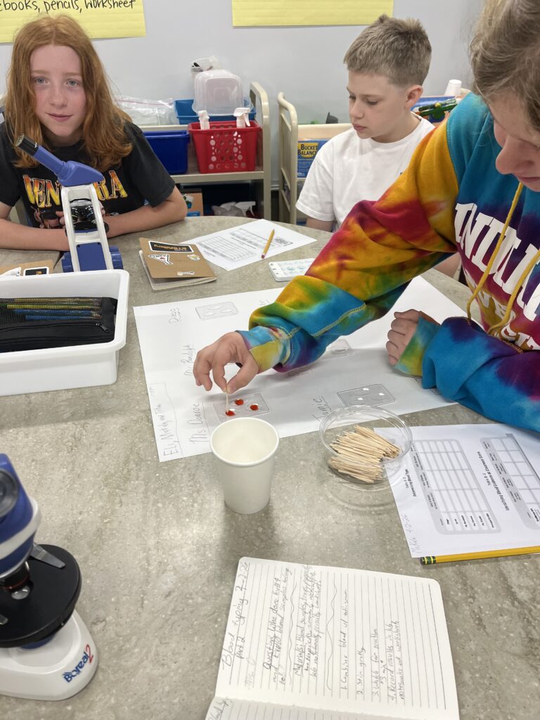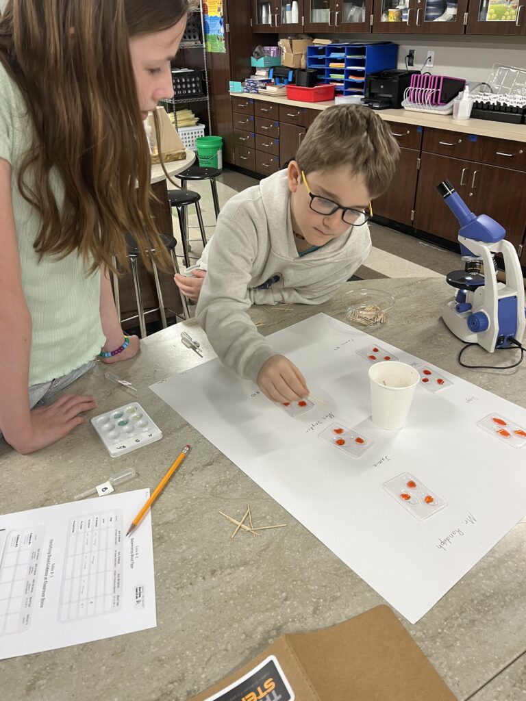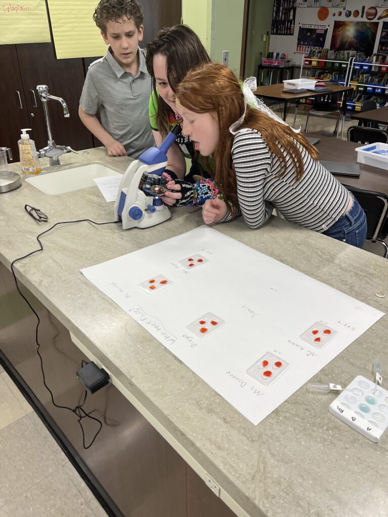 Fifth grade students continued with their “Who Took Fluffy” forensic case study. Dr. Baker was here to lead the students in a blood typing lab. They learned all about the different blood types. Students were given different blood samples (synthetic samples) and anti-serum and had to mix the samples and read them under a microscope to determine if there was a reaction and if there was they could determine the blood type.
