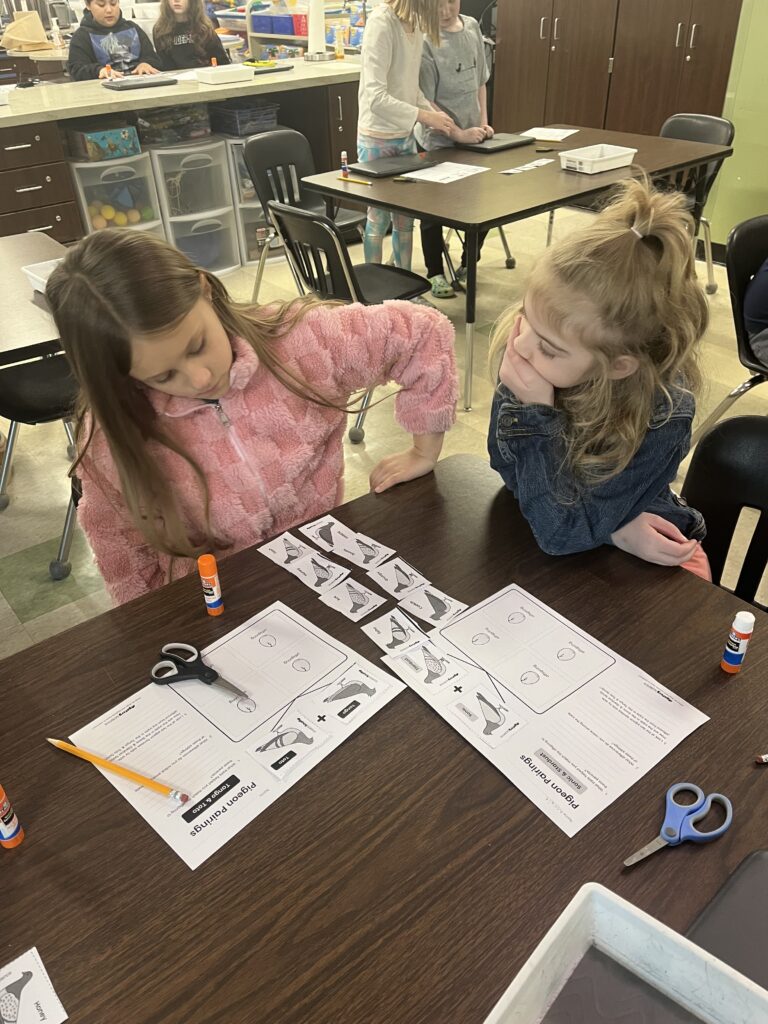 Third grade students explored the extreme trait variation of different dog breeds — and pet pigeon breeds! In the activity, Pigeon Pairings, students analyzed trait similarities and differences among parent, offspring, and sibling pigeons. They interpreted this data to discover that the variation and inheritance of traits creates a pattern that explains why we see such extreme traits in artificially selected animal breeds.