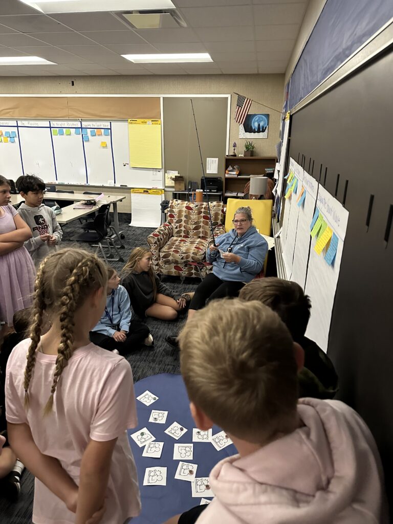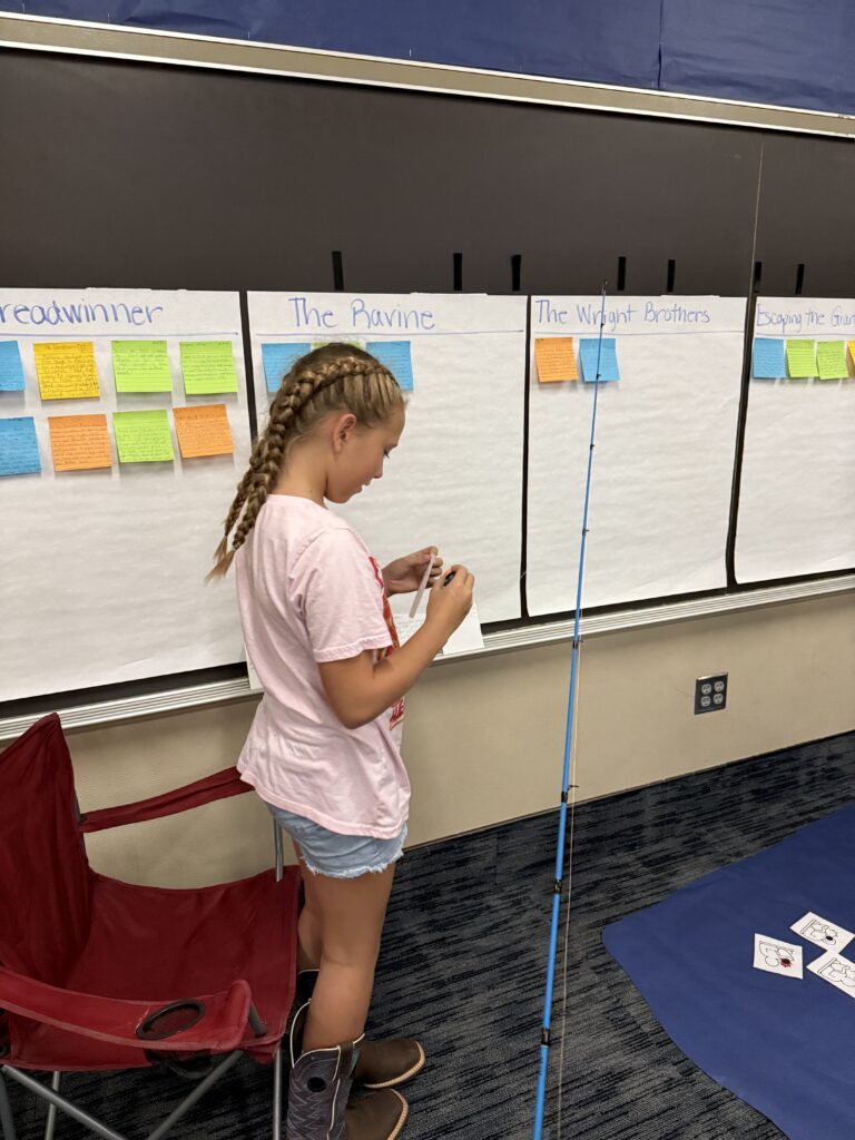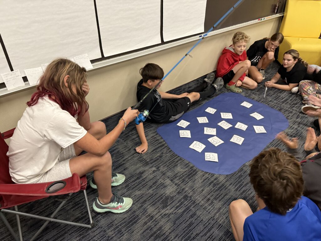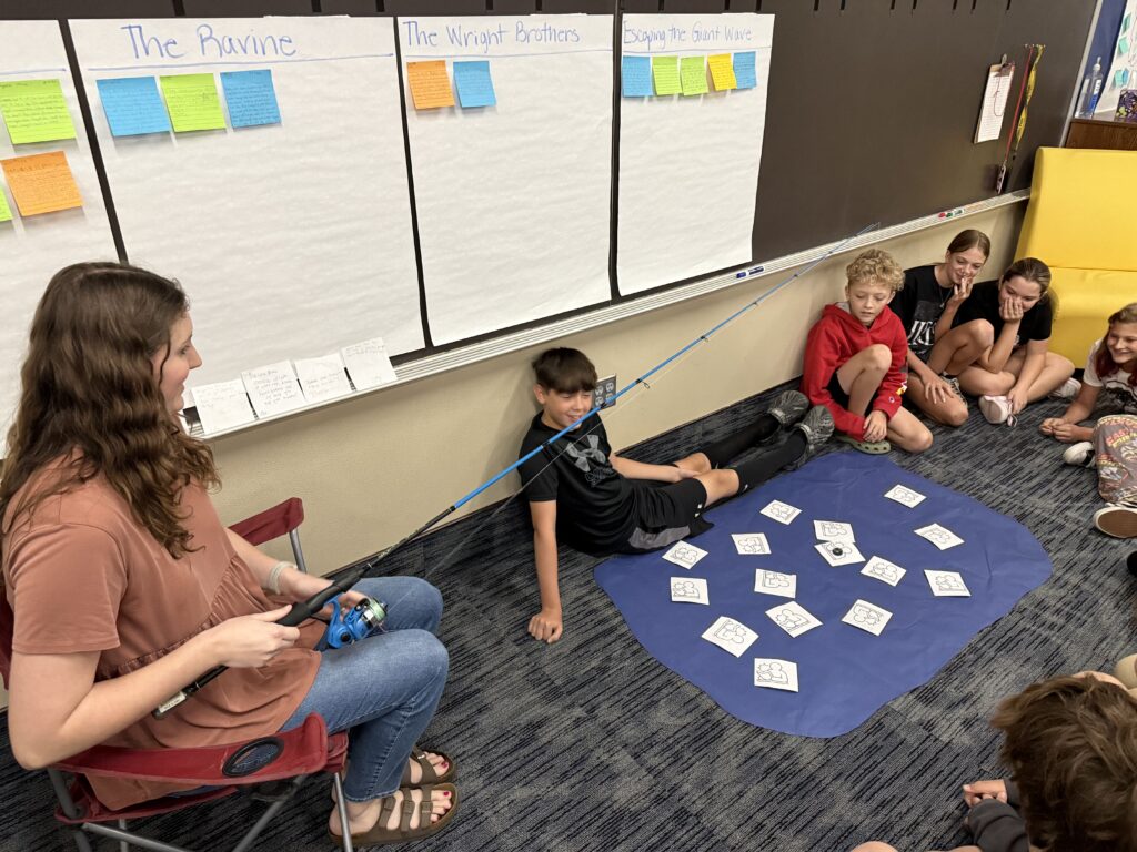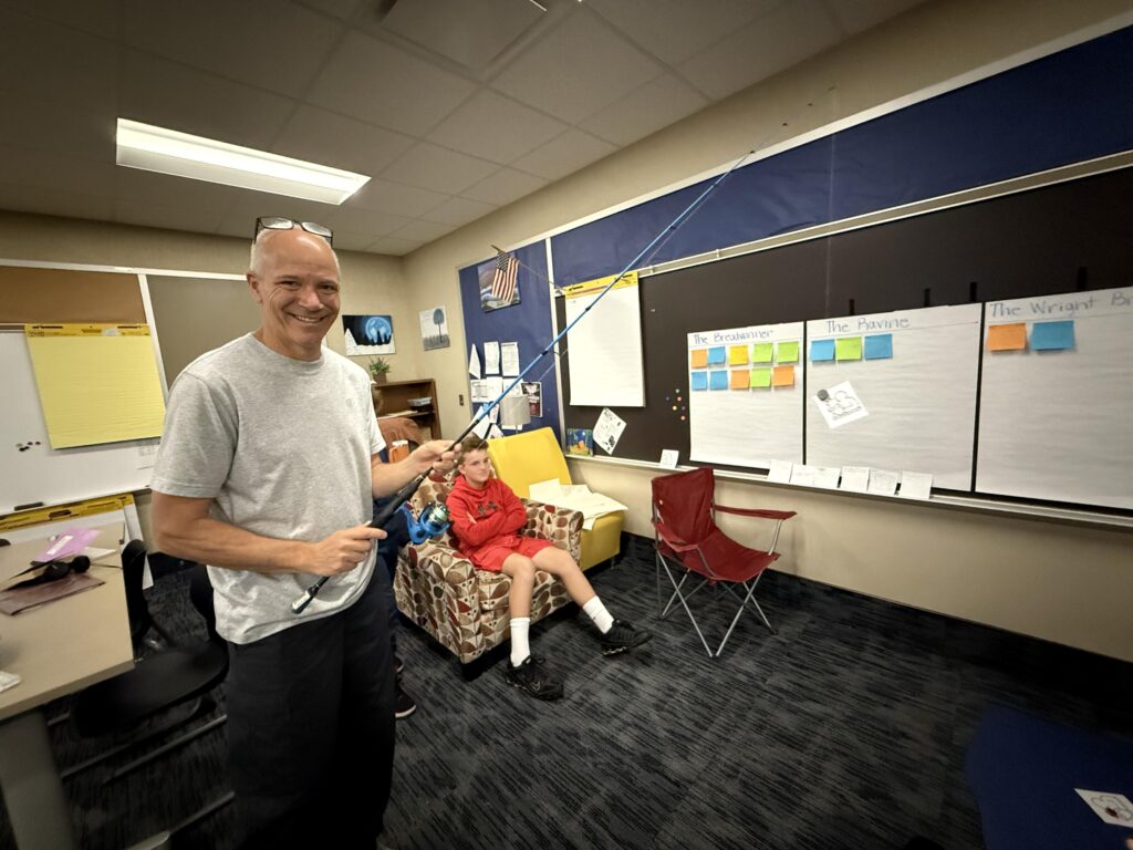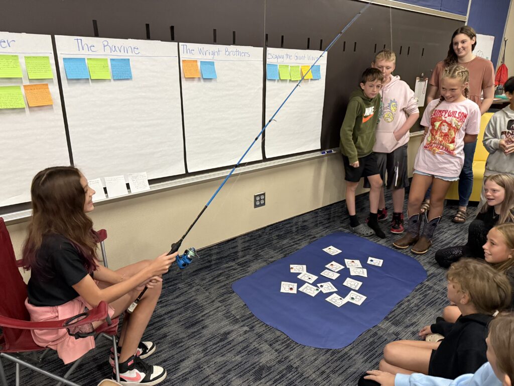 “I was teaching my ELA about interesting and engaging “hooks” for their introductory paragraph in an essay. I brought in my fishing pole, camp chair, and made a “pond” from large blue-colored paper. I tied a magnet to the end of the fishing line (no hook). Students brainstormed hooks for a topic with a partner, and then wrote one of their own on a Reader (paper with a clipart person). They used a glue stick to attach the paper to a small magnet and tossed it onto the “Water”. I fished out 4 of them and read the hooks aloud, one at a time. Some were great, some needed help to revise, which we did right there. I handed the pole to several others and we followed the same steps. There were lots of claps and cheers, smiles, and motivated kiddos! We even got Mrs. Fowler and Mr. T Miller involved!“