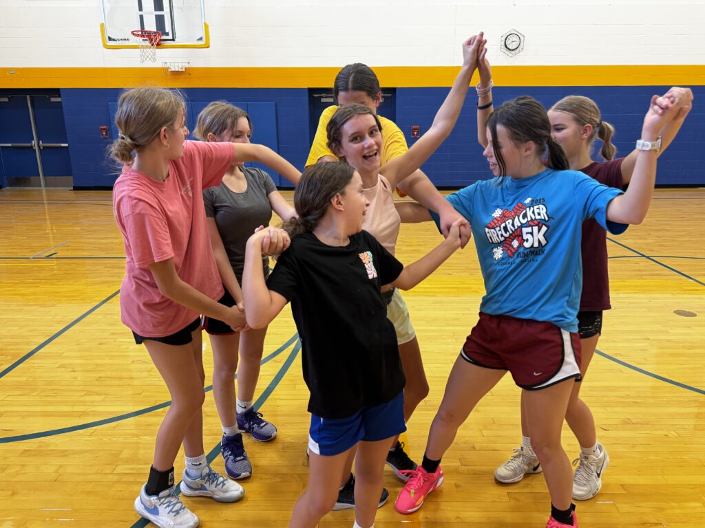 8th-grade girls’ basketball works on team-building by undoing the knot they created by holding hands.