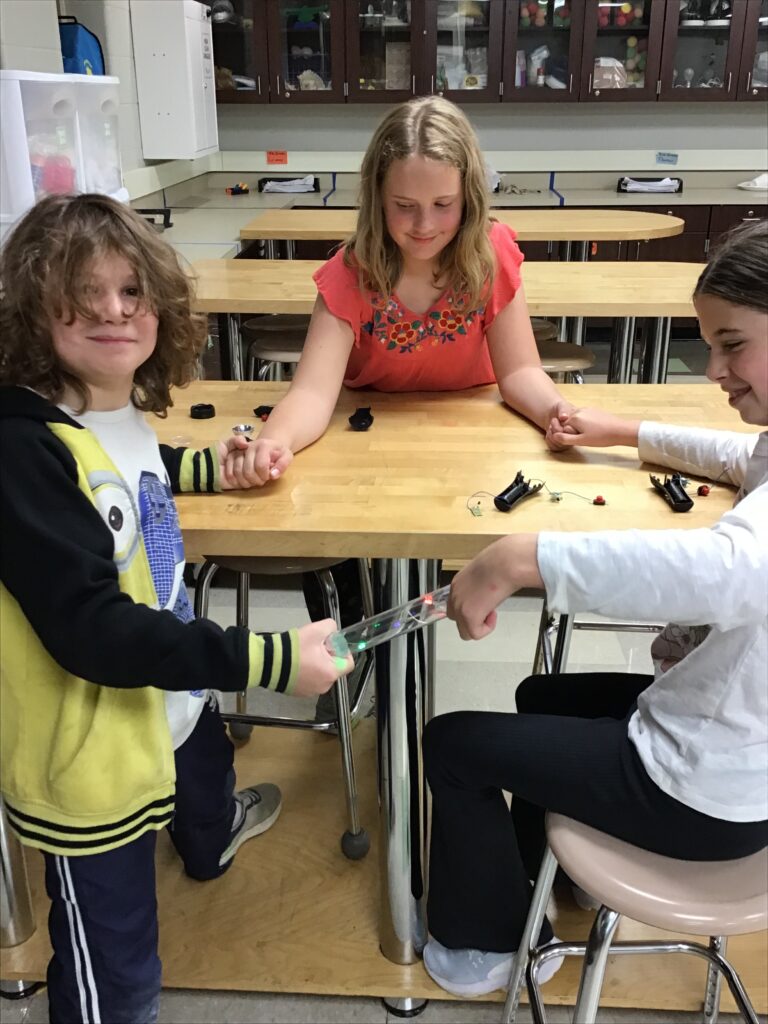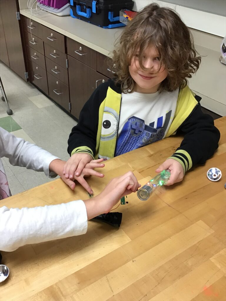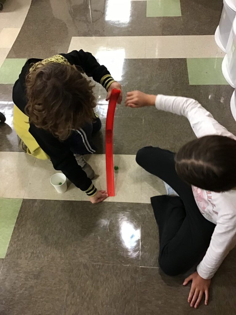 4th graders exploring different energy centers to see how different types energy work. They tested out super cars, marbles on tracks, cup bowling, and how lights and energy sticks work.