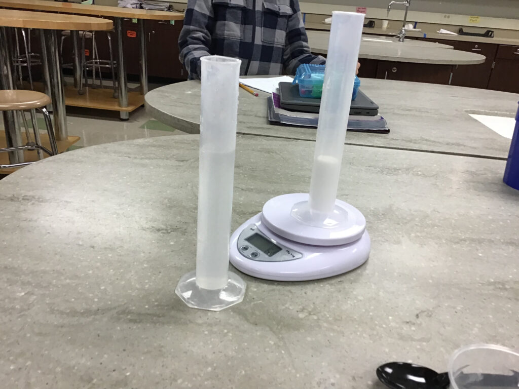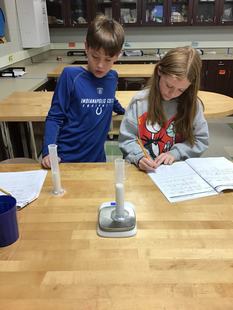 5th graders mixing matter. Students mixing different substances to see what happens to the mass when they are mixed. They are learning about the law of conservation of mass.