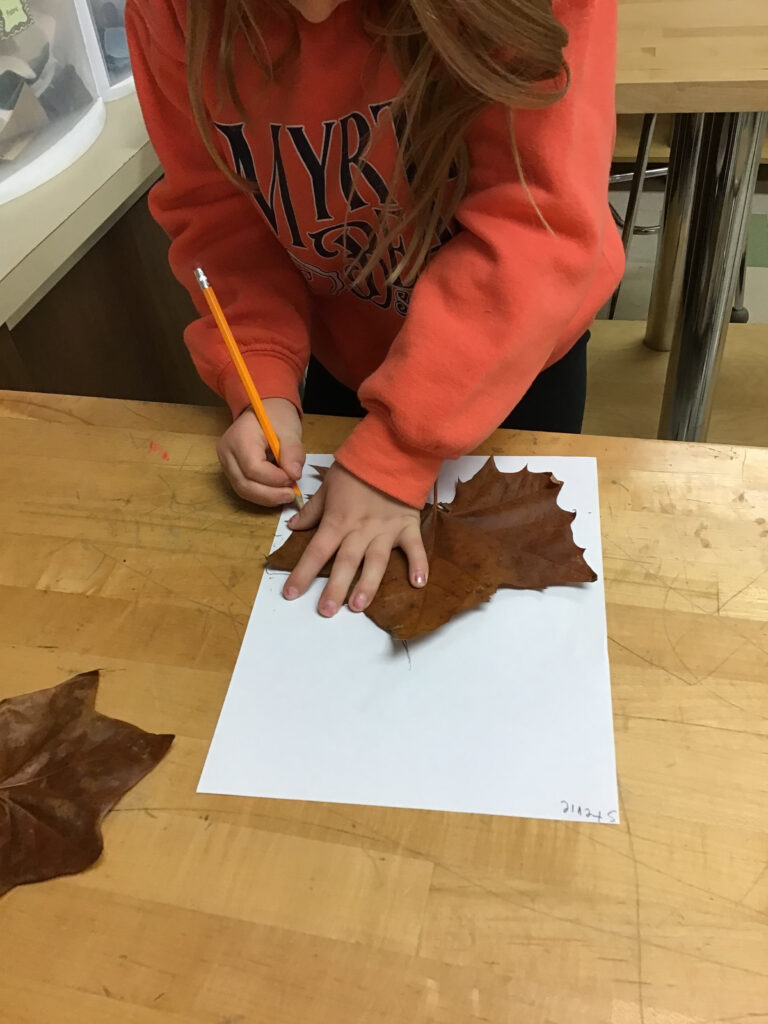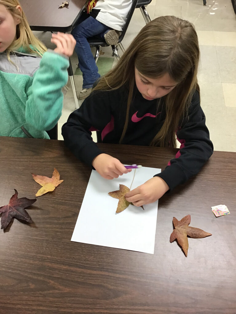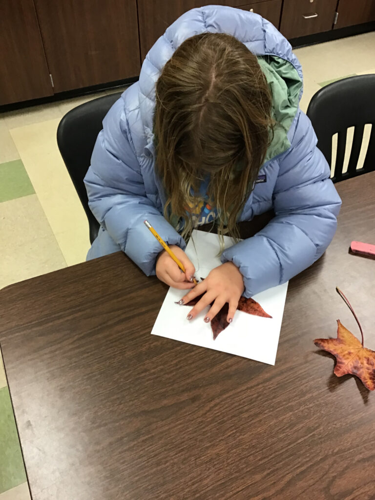 2nd graders drawing leaves and making notes about their texture and color. They are also predicting what will happen when the leaves are frozen.